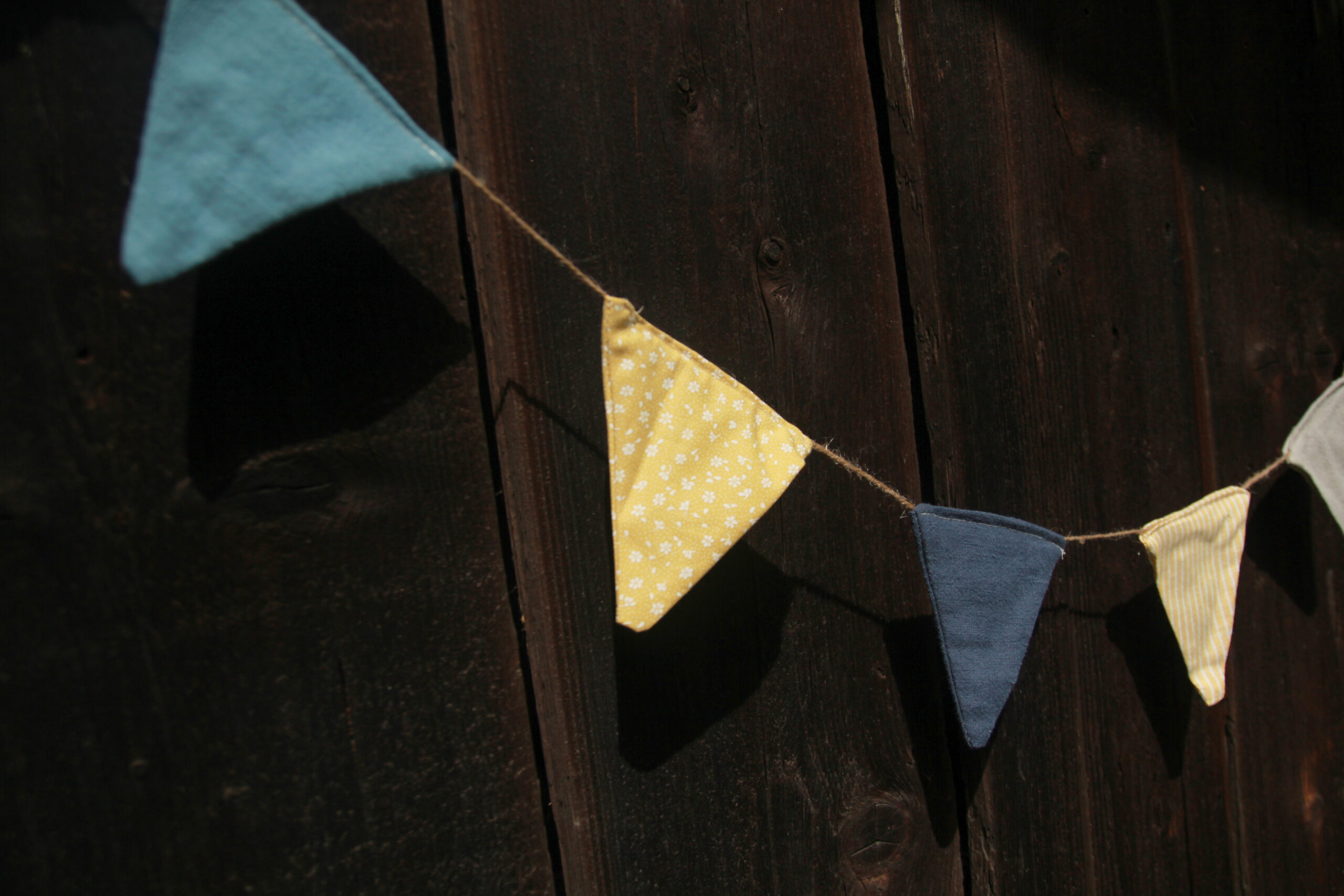 Girlanda w niebieskie i żółte wzory wykonana z lnianych oraz bawełnianych materiałów, wykończona jutowym sznurkiem.